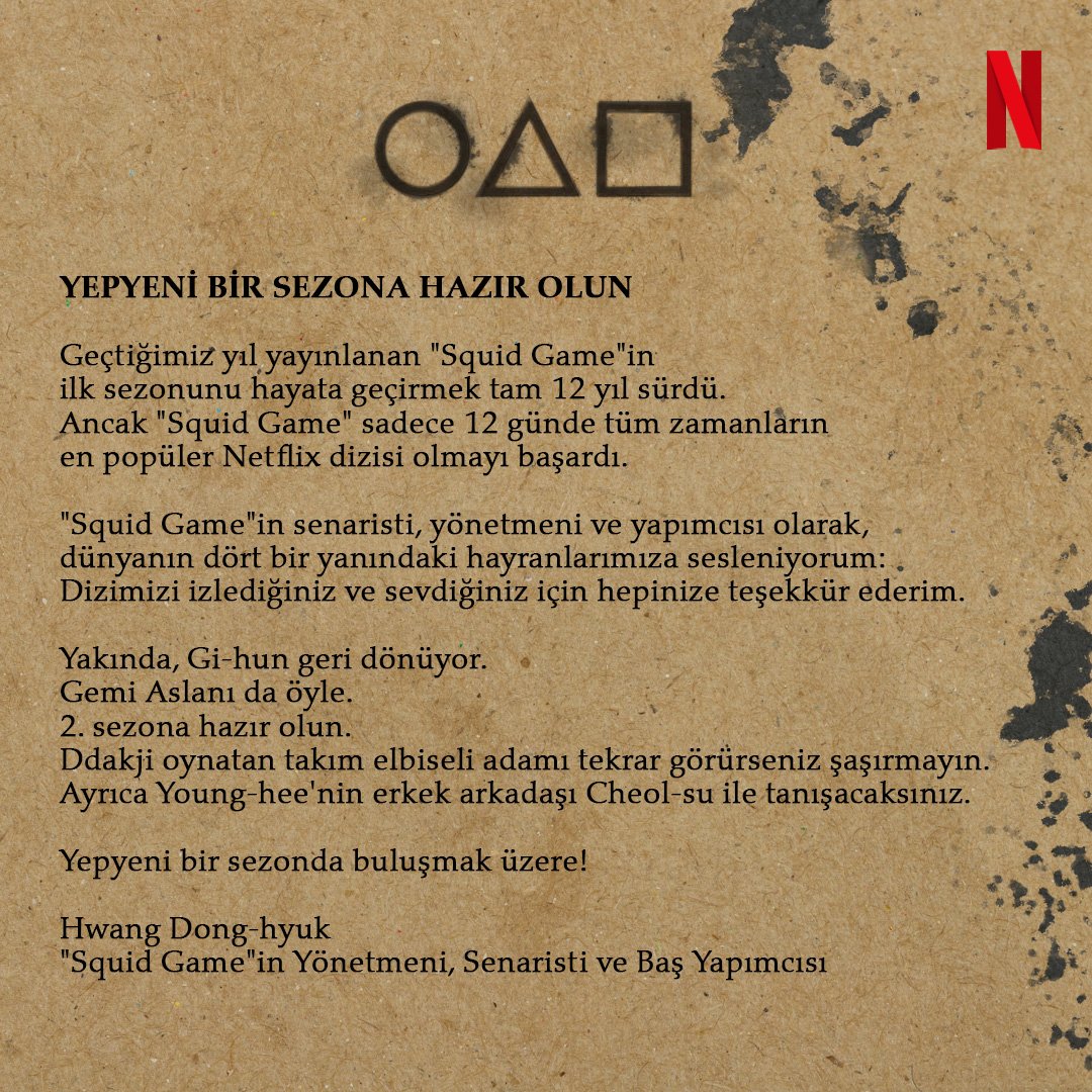 Netflix, geçtiğimiz yıl gösterilen ve toplumsal medyada fazlaca gündem olmayı başaran beğenilen dizisi Squid Game’in ikinci sezonunu Twitter üstünden paylaşmış olduğu ‘çağrı kartı’ ile resmen duyurdu.