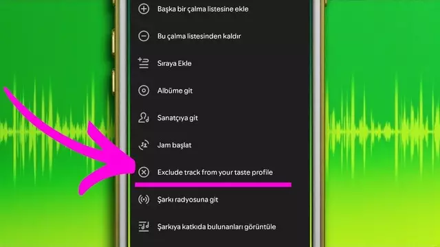 Bu özellik, bilhassa “çocuklar için şarkılar” ya da “guilty pleasure” olarak dinlenen içeriklerin algoritmayı karıştırmasını istemeyen kullanıcılar için yararlı. Tavsiye algoritmanızdan çıkarmak istediğiniz şarkıyı tam ekran açıp üç nokta simgesine dokunduktan sonrasında “Exclude track from your taste profile” seçeneğine dokunmanız kafi. Spotify bu seçeneği niçin Türkçeleştirmedi bilmiyoruz.