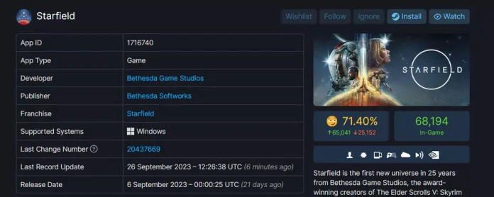 Starfield’ın Steam’deki listeleme sayfasını denetim ettiğimizde, bu oyun için 90 bin civarında yorum yapıldığını ve bunların yüzde 72 kadarının pozitif yönde bulunduğunu görüyoruz. Daha duyarlı verilere ulaşmak için SteamDB’de yaptığımız kontrollerde ise daha çarpıcı bir durumla karşılaşıyoruz. SteamDB’deki veriler, oyuna meydana getirilen yorumların yüzde 71,40’ının pozitif yönde bulunduğunu gözler önüne seriyor. Bu oran, Starfield’ı Bethesda’nın minimum beğenilen oyunu olarak lanse edilmesine yol açtı.